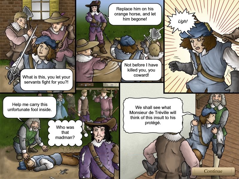 Befriend the three musketeers: Athos, Aramis, and Pothos. Athos is the oldest and the noblest of the three. His background is shrowded in mystery - nobody knows his true name. Aramis is but temporarily a Musketeer. His true calling is that of the priesthood. The massive Porthos may not be as clever as is friends, but he has the strength of ten men.